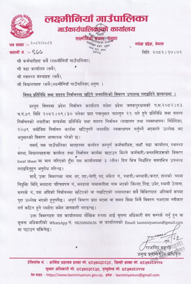 प्रतिनिधि सभा सदस्य निर्वाचनमा खटिने जनशक्तिको विवरण उपलब्ध गराइदिने सम्बन्धमा